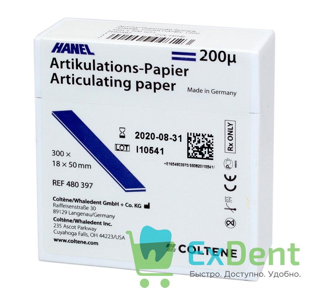 Купить Артикуляционная бумага прямая, синяя HANEL (200 мкм х 300 шт) произведенный компанией COLTENE вы можете в ExDent.ru по цене 1 670руб.