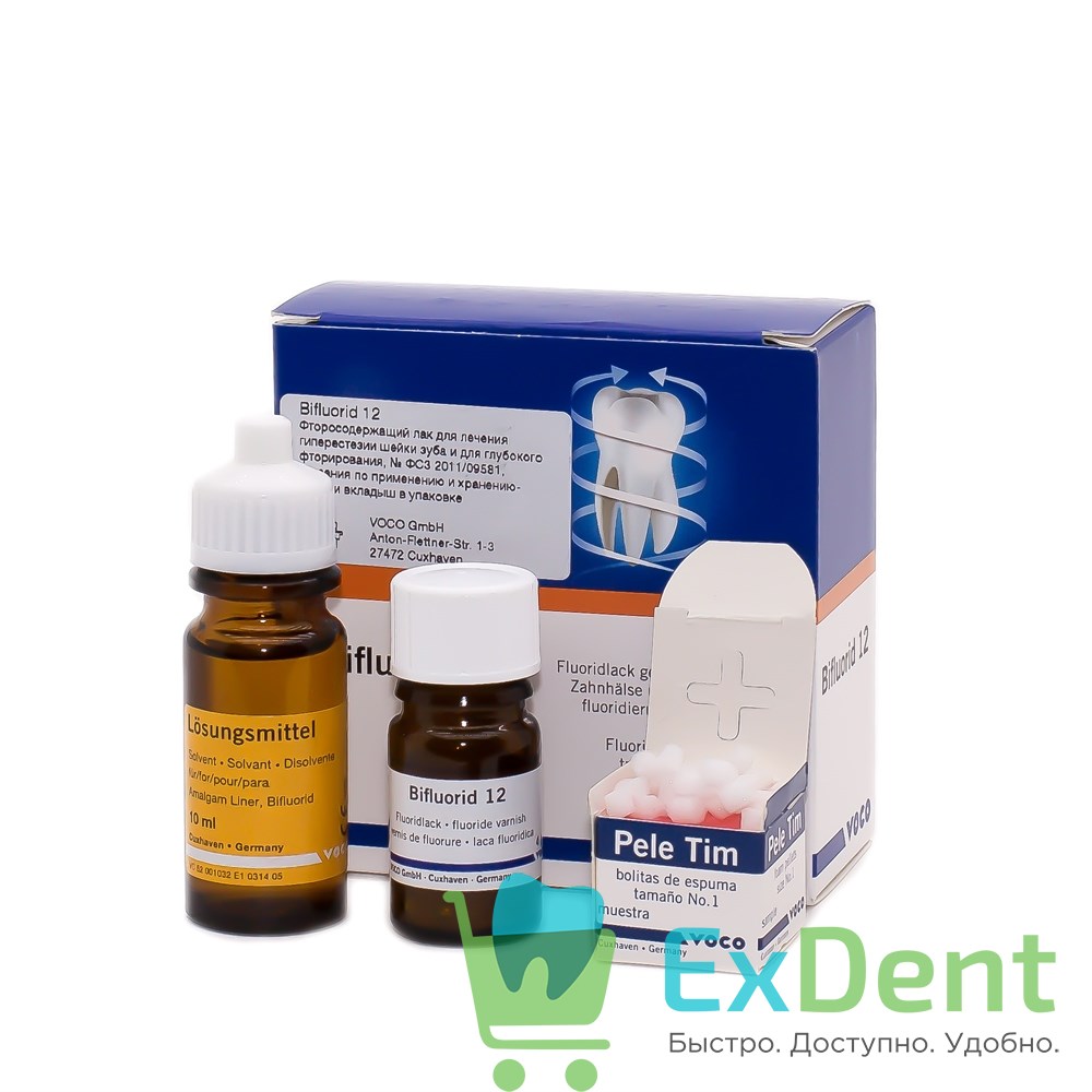 Бифлюорид 12 — фторлак для лечения гиперестезии, для глубокой флюоризации и для профилактики кариеса. Фтористый лак из синтетических смол для точечной обработки кисточкой. Препарат Бифлюорид 12 для лечения гиперестезии шейки зуба и глубокого фторирования. Является прозрачным фтористым лаком с содержанием фторида натрия и фторида кальция в соотношении, дающем максимальный эффект. Обеспечивая хорошую термоизоляцию, препарат приводит к глубокому фторированию длительного действия. Благодаря прозрачности особенно пригоден для локального косметического фторирования. Бесцветный фтористый лак с фторидами натрия и кальция.
