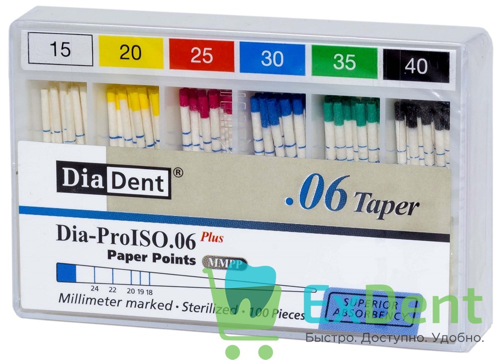 Купить Бумажные штифты 06 №15-40 DiaDent для удаления влаги в канале (100 шт) произведенный компанией DiaDent вы можете в ExDent.ru по цене 650руб.