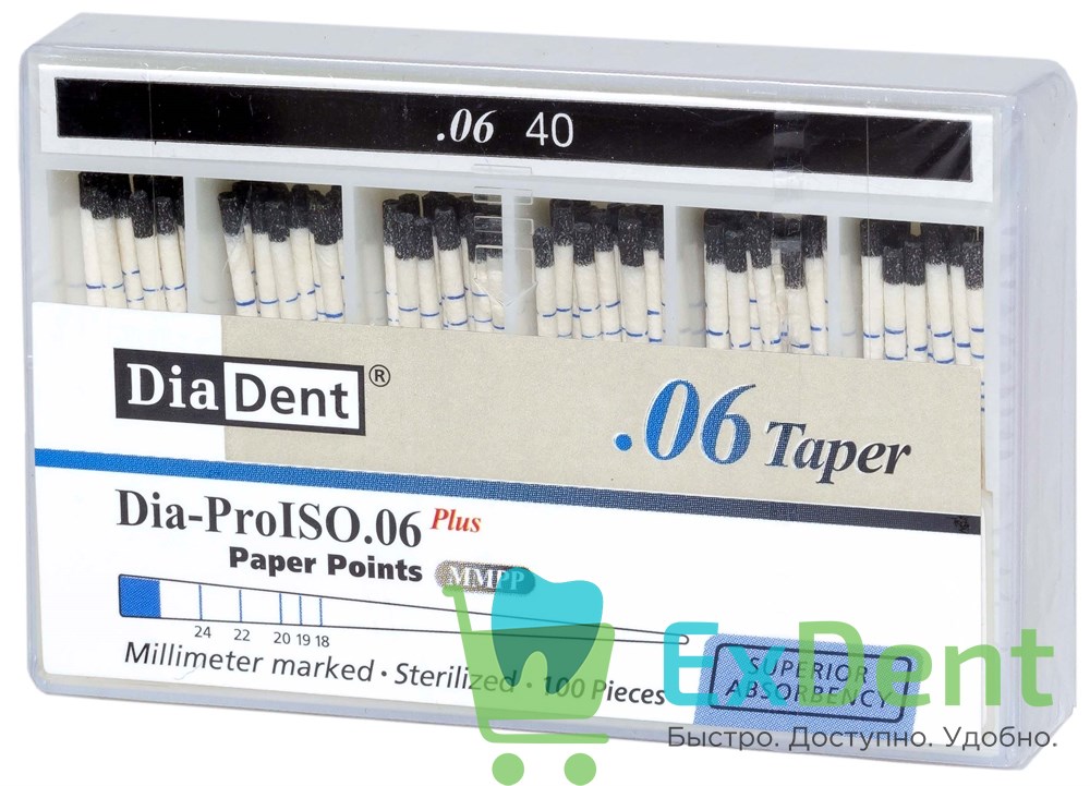 Купить Бумажные штифты 06 №40 DiaDent для удаления влаги в канале (100 шт) произведенный компанией DiaDent вы можете в ExDent.ru по цене 0руб.