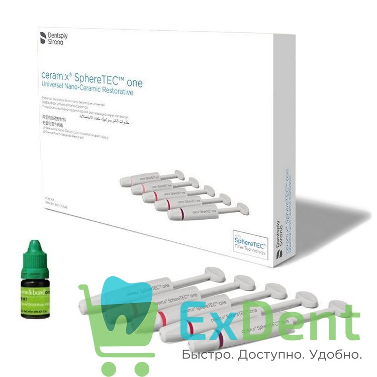 Сeram. X® SphereTEC™ one – инновационный универсальный композит с великолепными манипуляционными свойствами и простым подбором оттенков. Сeram. X® SphereTEC™ подходит для прямых и непрямых реставраций, не ограничен реставрациями по второму классу. В новом Ceram. X® one используется инновационный наполнитель SphereTEC™. Наполнитель состоит из сферических частиц бариевого стекла. У каждой частички разный диаметр, в среднем 15 микрон. Благодаря применению наполнителя SphereTEC™ материал легко моделировать и адаптировать к стенкам полости. Частички удерживают форму сферы благодаря полимеризованной смоле.