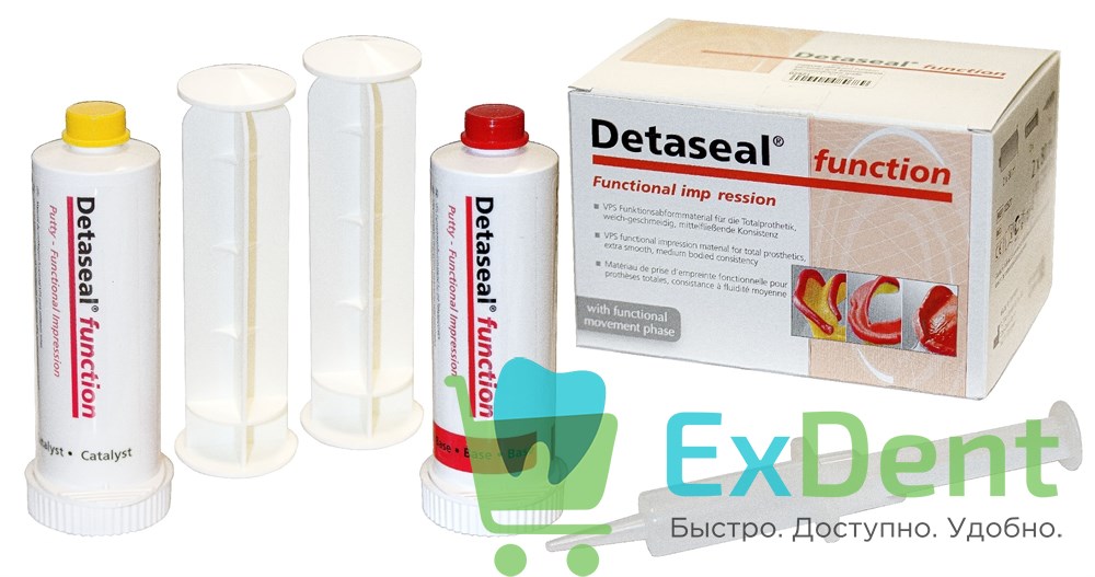 Оттискной материал Detaseal function для снятия точного оттиска предназначается для функционального оттиска и функционального оформления краев индивидуальной ложки, аддитивного типа, разминаемый. Идеальная мягкопластичная консистенция, очень хорошо изменяет форму, при снятии оттиска не оттесняет слизистую оболочку, сохраняет стабильность формы и объема. С определенной пластичной фазой и продленной фазой отверждения в полости рта. Оптимальный контроль смешивания благодаря контрастным цветам