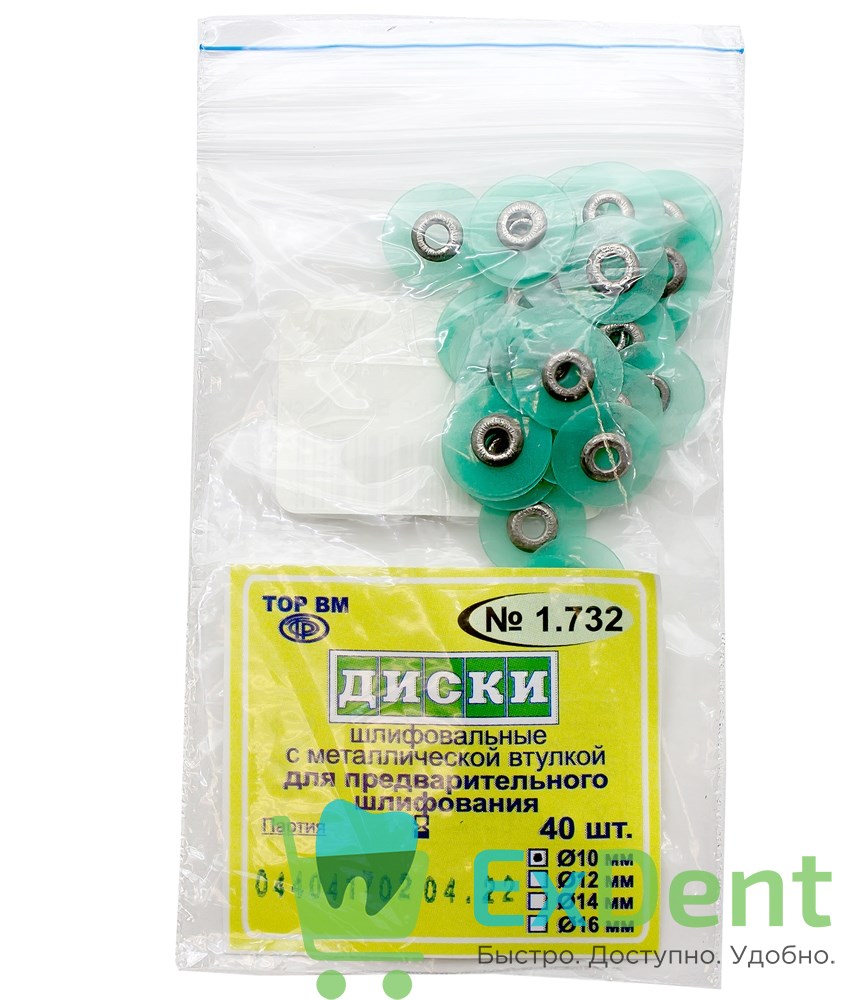 Купить Диски шлифовальные с металлической втулкой зеленые, для предварительного шлифования, 10 мм (40 шт) произведенный компанией ТОР ВМ вы можете в ExDent.ru по цене 230руб.