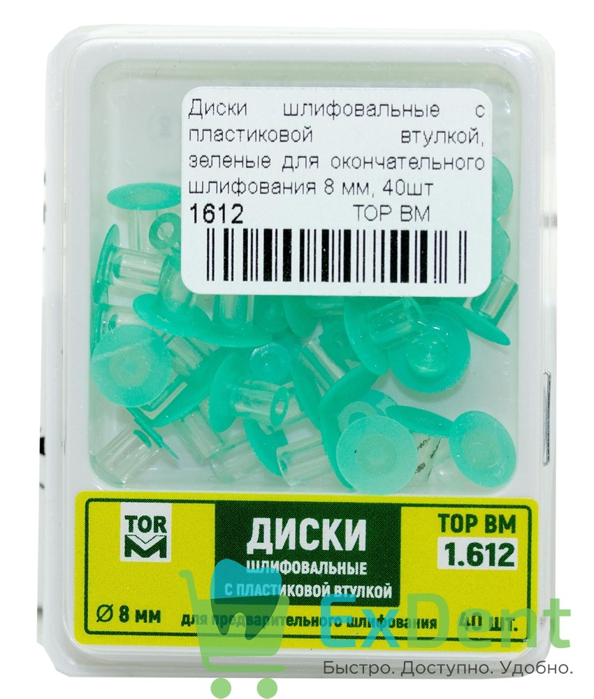 Купить Диски шлифовальные с пластиковой втулкой, зеленые для окончательного шлифования 8 мм, 40шт произведенный компанией ТОР ВМ вы можете в ExDent.ru по цене 0руб.
