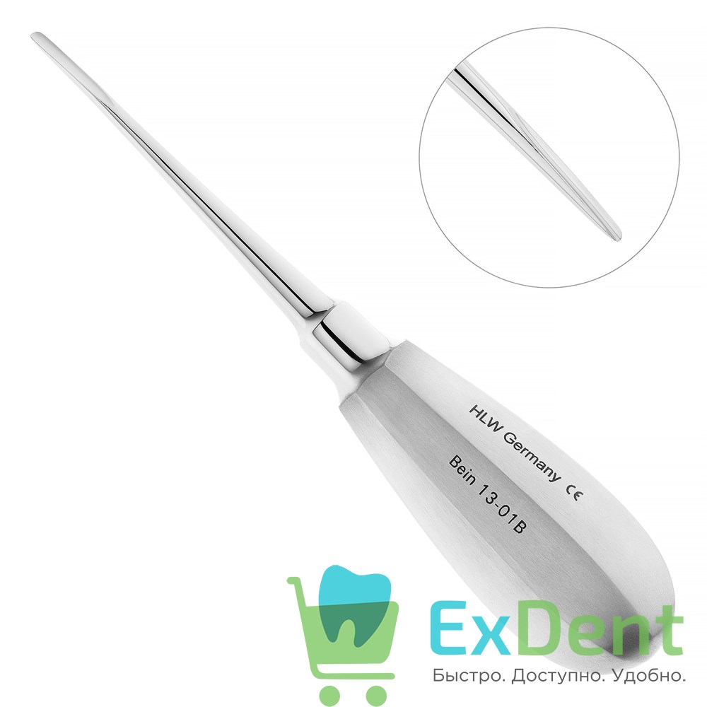 Элеватор конструкции Бейна производства немецкой компании HLW Dental Instruments используется для удаления корней и зубов на верхней и, в ряде случаев, на нижней челюсти.