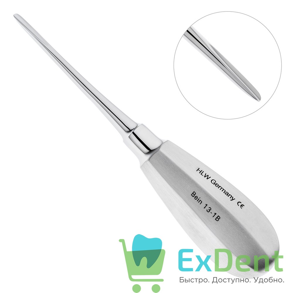 Для удаления корней и зубов на верхней и нижней челюсти применяется элеватор конструкции Бейна производства немецкой компании HLW Dental Instruments.
