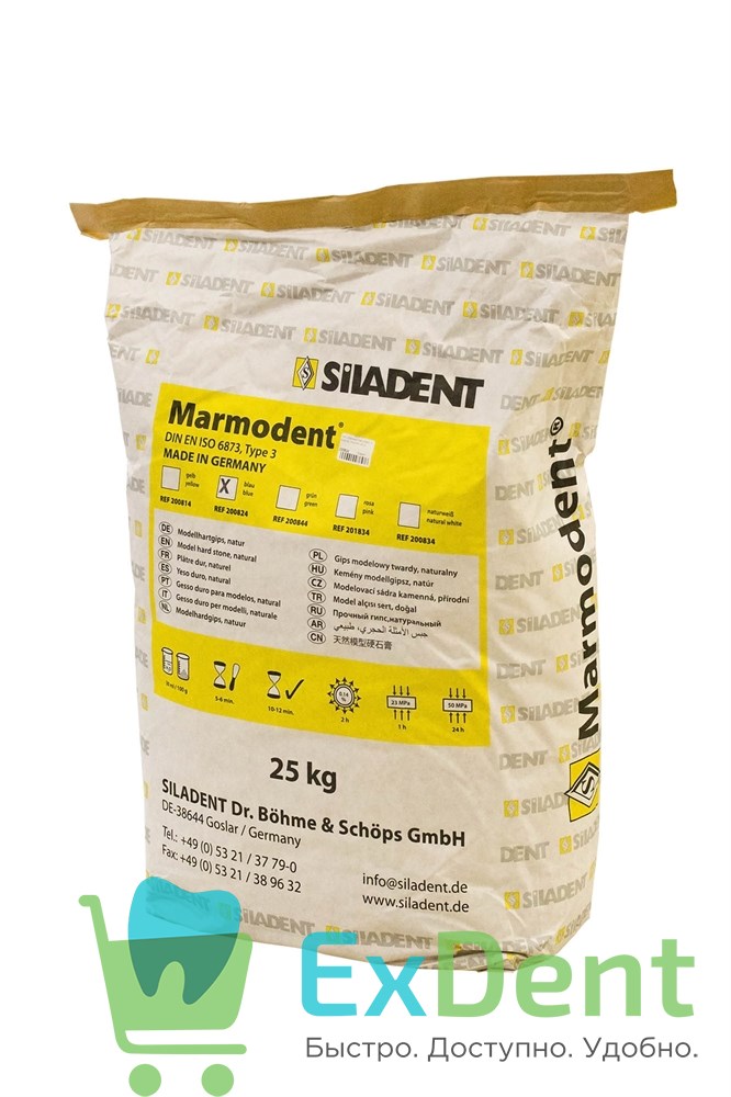 Купить Гипс прочный Marmodent, 3 класса, голубой (25 кг) произведенный компанией Siladent вы можете в ExDent.ru по цене 3 530руб.