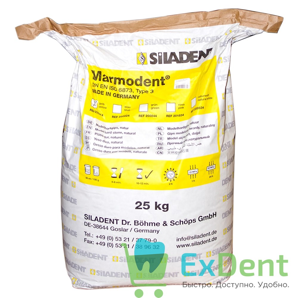 Купить Гипс прочный Marmodent, 3 класса, желтый (25 кг) произведенный компанией Siladent вы можете в ExDent.ru по цене 0руб.