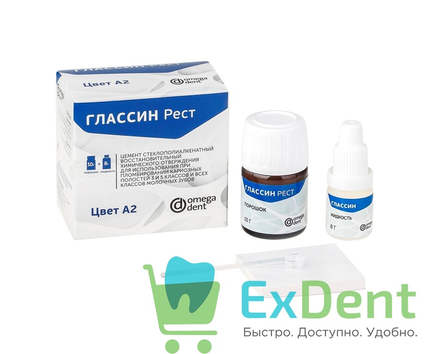 ГЛАССИН Рест – это стеклополиалкенатный (стеклоиономерный) рентгенконтрастный пломбировочный материал, применяющийся в стоматологической практике при замещении зубной ткани в кариозных полостях III и V классов, пломбировании некариозных поражений, замещении ткани в полостях молочных зубов (всех классов), а также использующийся в качестве подкладки под все виды пломб.