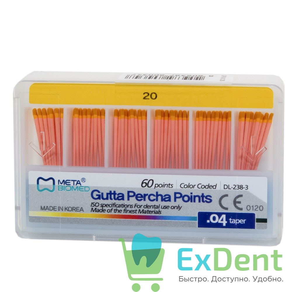 Купить Гуттаперчевые штифты 04 №20 Meta - для пломбирования корневых каналов (60 шт) произведенный компанией META вы можете в ExDent.ru по цене 0руб.