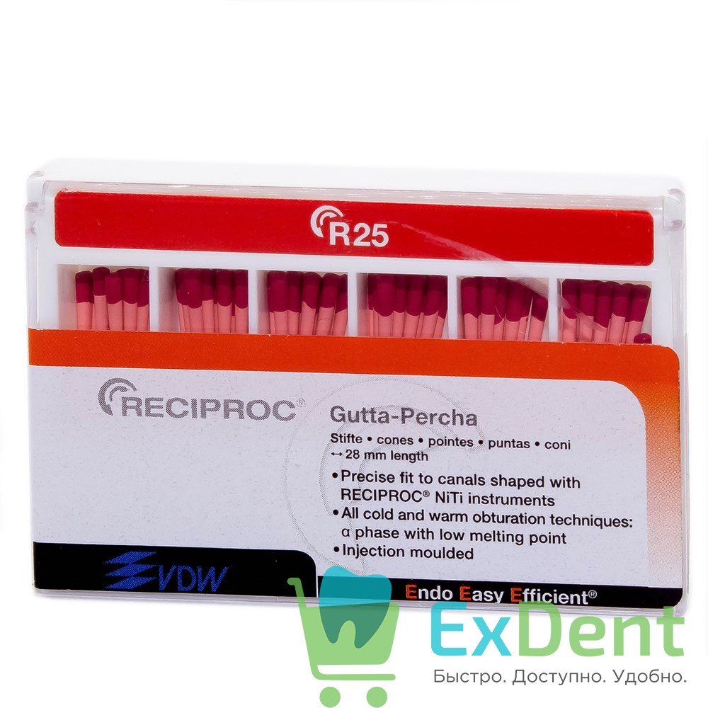 Гуттаперчевые штифты RECIPROC® обладают большей конусностью, которая соответствует индивидуальной форме инструментов R25, R40 и R50. Эти штифты изготавливаются при помощи инновационного процесса литья под давлением, благодаря чему они обеспечивают аккуратное и идеально соответствующее форме канала наполнение.