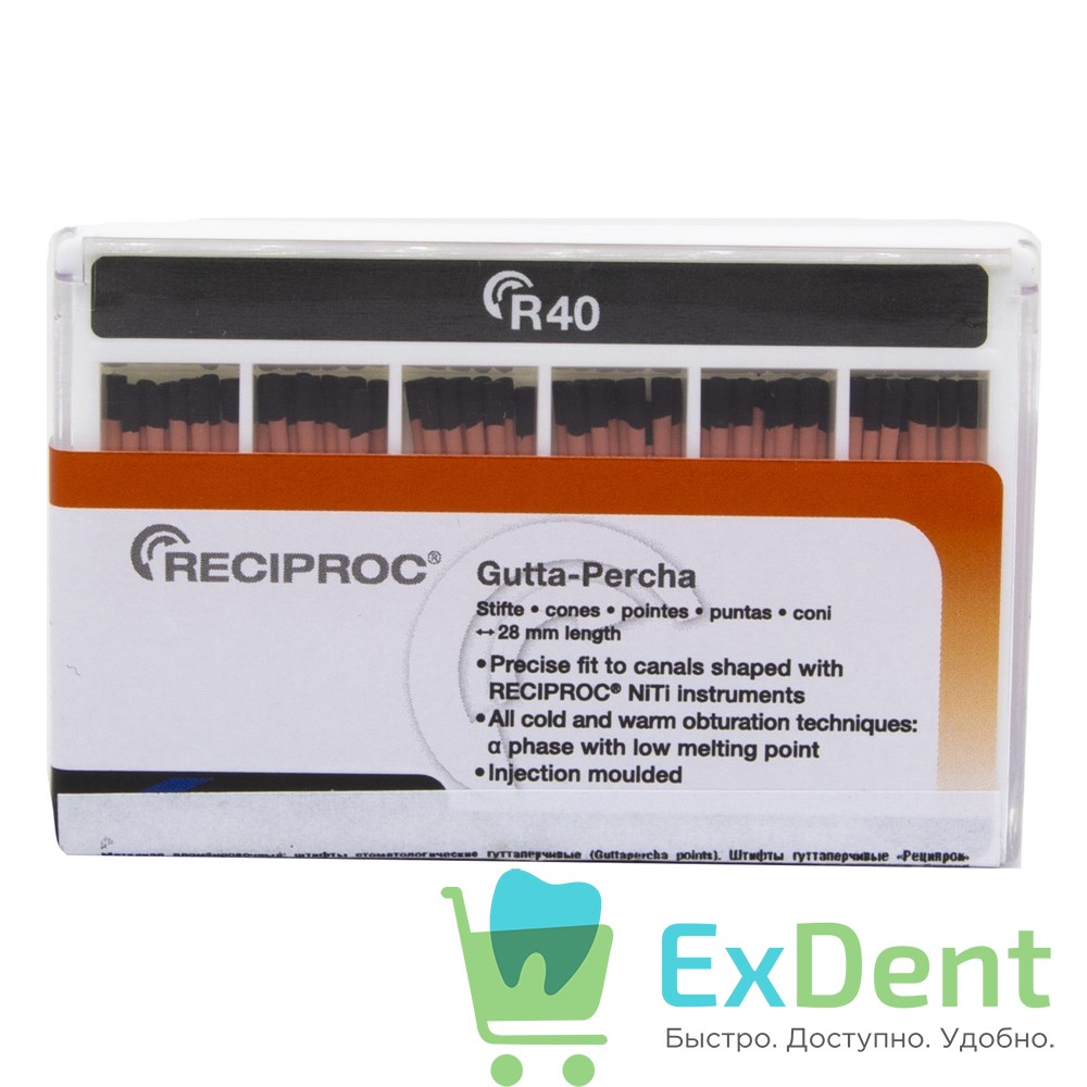 Купить Гуттаперчевые штифты под Reciproc №40 - для пломбирования каналов (60 шт) произведенный компанией вы можете в ExDent.ru по цене 0руб.