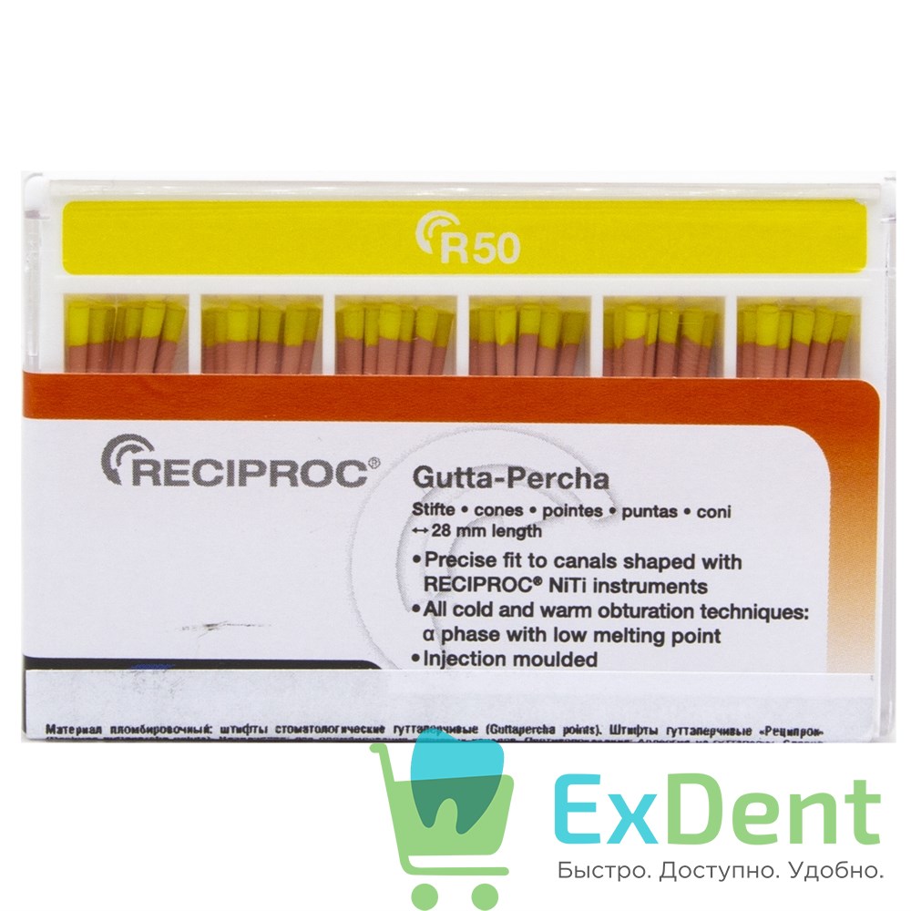 Купить Гуттаперчевые штифты под Reciproc №50 - для пломбирования каналов (60 шт) произведенный компанией вы можете в ExDent.ru по цене 0руб.