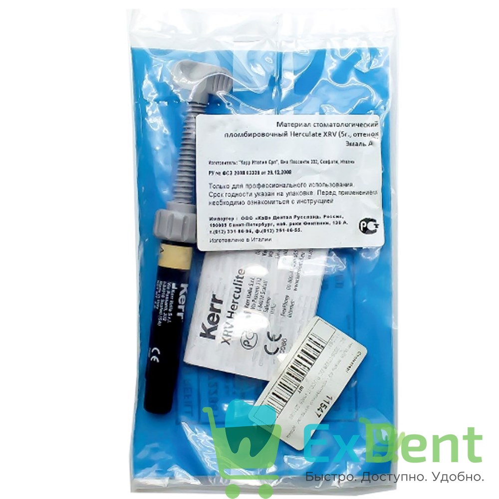 - 62830 Herculite™ XRV™ Mini Kit - мини-набор3 шприца (по 3 г): эмаль А2, А3,5; дентин А2, 1 бутылочка (3 мл) OptiBond Solo Plus, 1 шприц (3 г) протравливающего геля с 10 насадками, 50 аппликаторов