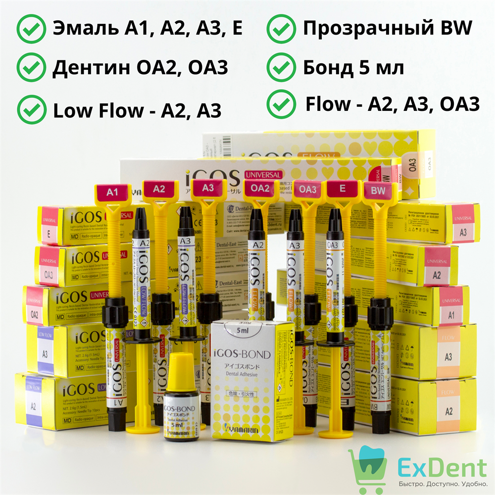 Купить iGOS (Айгос) - ПРО комплект композитных материалов (12 х 4 г + бонд 5 мл) произведенный компанией YAMAKIN вы можете в ExDent.ru по цене 24 400руб.