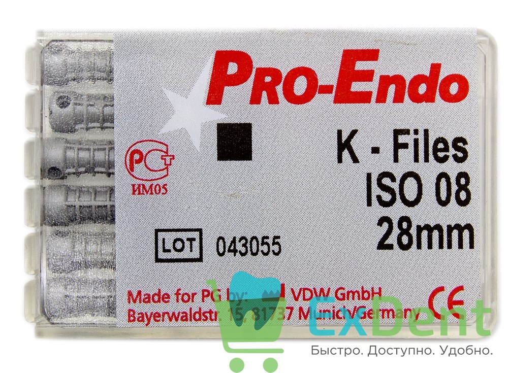 K-Files №08, 28 мм, Pro-Endo, для препарирования канала, нержавеющая сталь (6 шт)