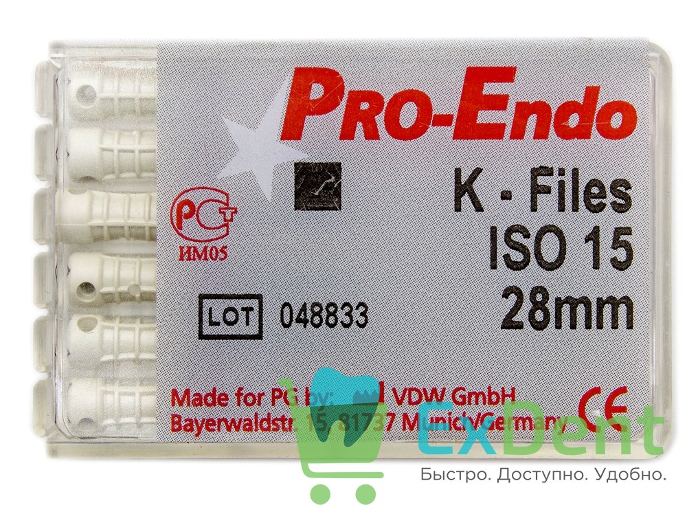 Купить K-Files №15, 28 мм, Pro-Endo, для препарирования канала, нержавеющая сталь (6 шт) произведенный компанией VDW вы можете в ExDent.ru по цене 270руб.