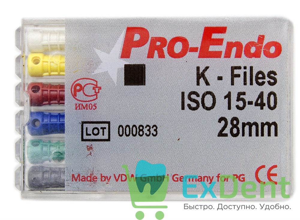 K-Files №15-40, 28 мм, Pro-Endo, для препарирования канала, нержавеющая сталь (6 шт)