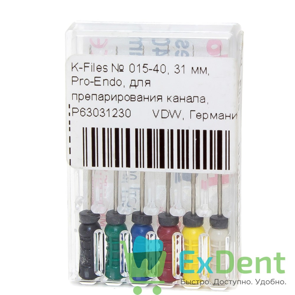 K-Files №15-40, 31 мм, Pro-Endo, для препарирования канала, нержавеющая сталь (6 шт)