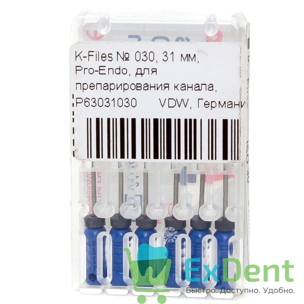 Купить K-Files №30, 31 мм, Pro-Endo, для препарирования канала, нержавеющая сталь (6 шт) произведенный компанией VDW вы можете в ExDent.ru по цене 270руб.