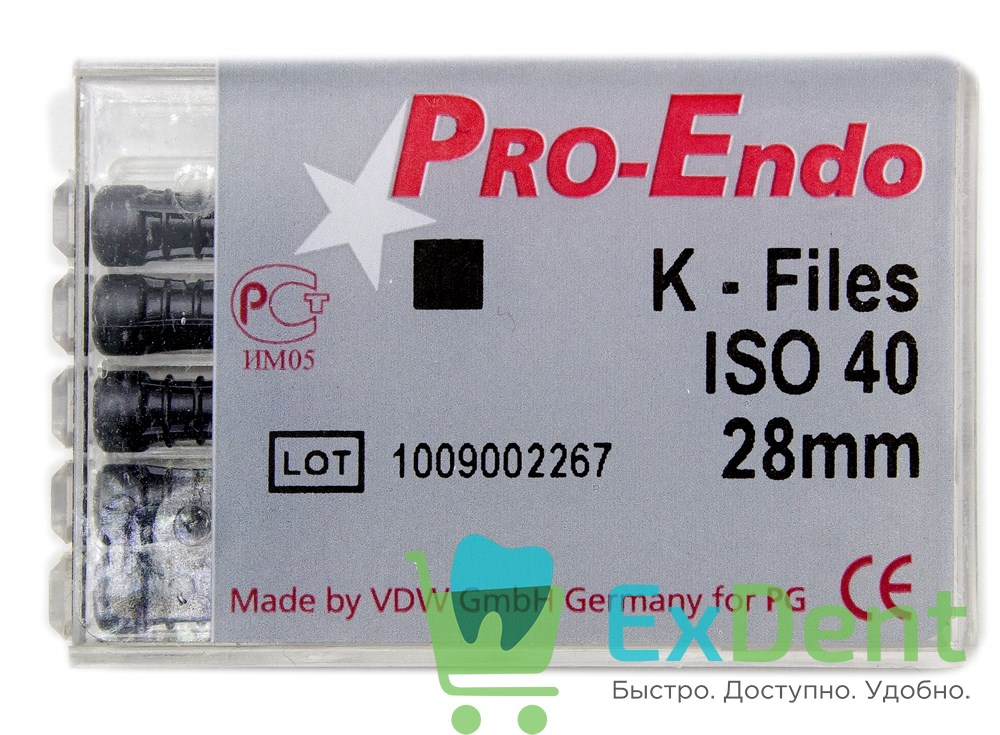 K-Files №40, 28 мм, Pro-Endo, для препарирования канала, нержавеющая сталь (6 шт)