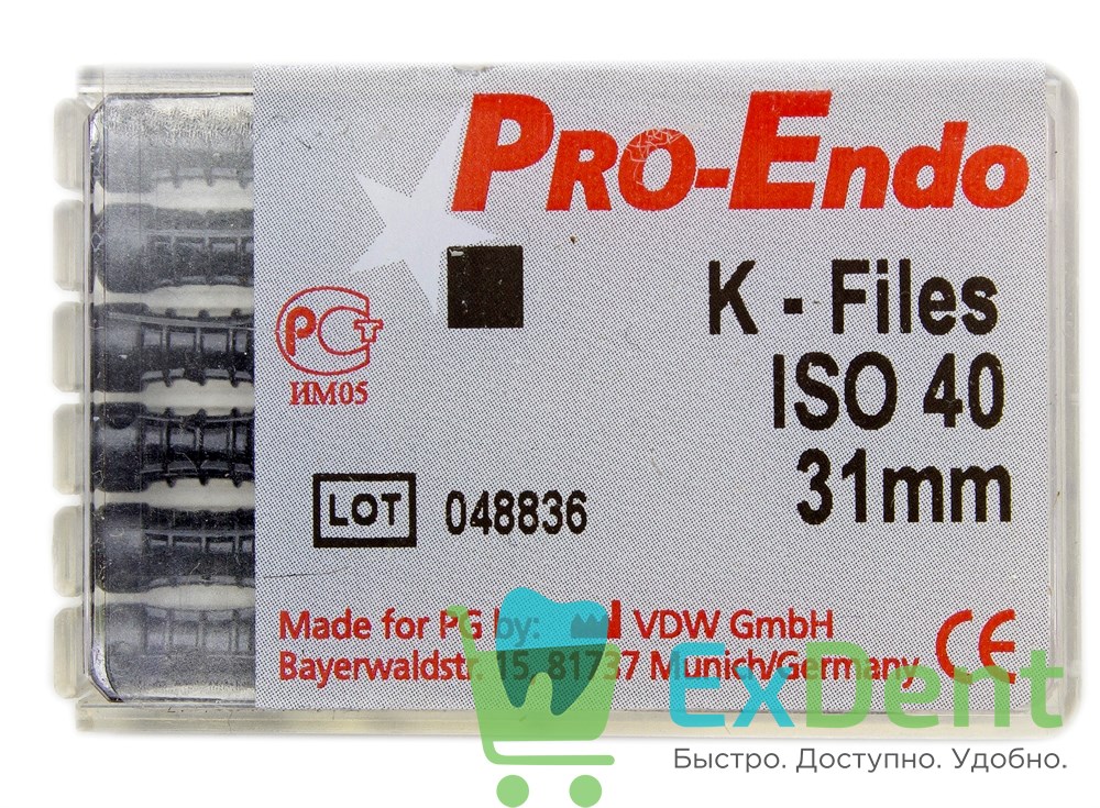 Купить K-Files №40, 31 мм, Pro-Endo, для препарирования канала, нержавеющая сталь (6 шт) произведенный компанией VDW вы можете в ExDent.ru по цене 270руб.