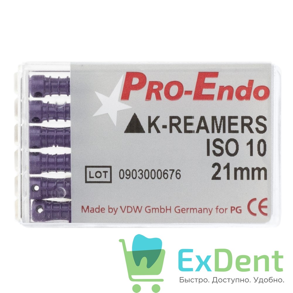 K-Reamers №10, 21 мм, Pro-Endo, для препарирования канала, нержавеющая сталь (6 шт)