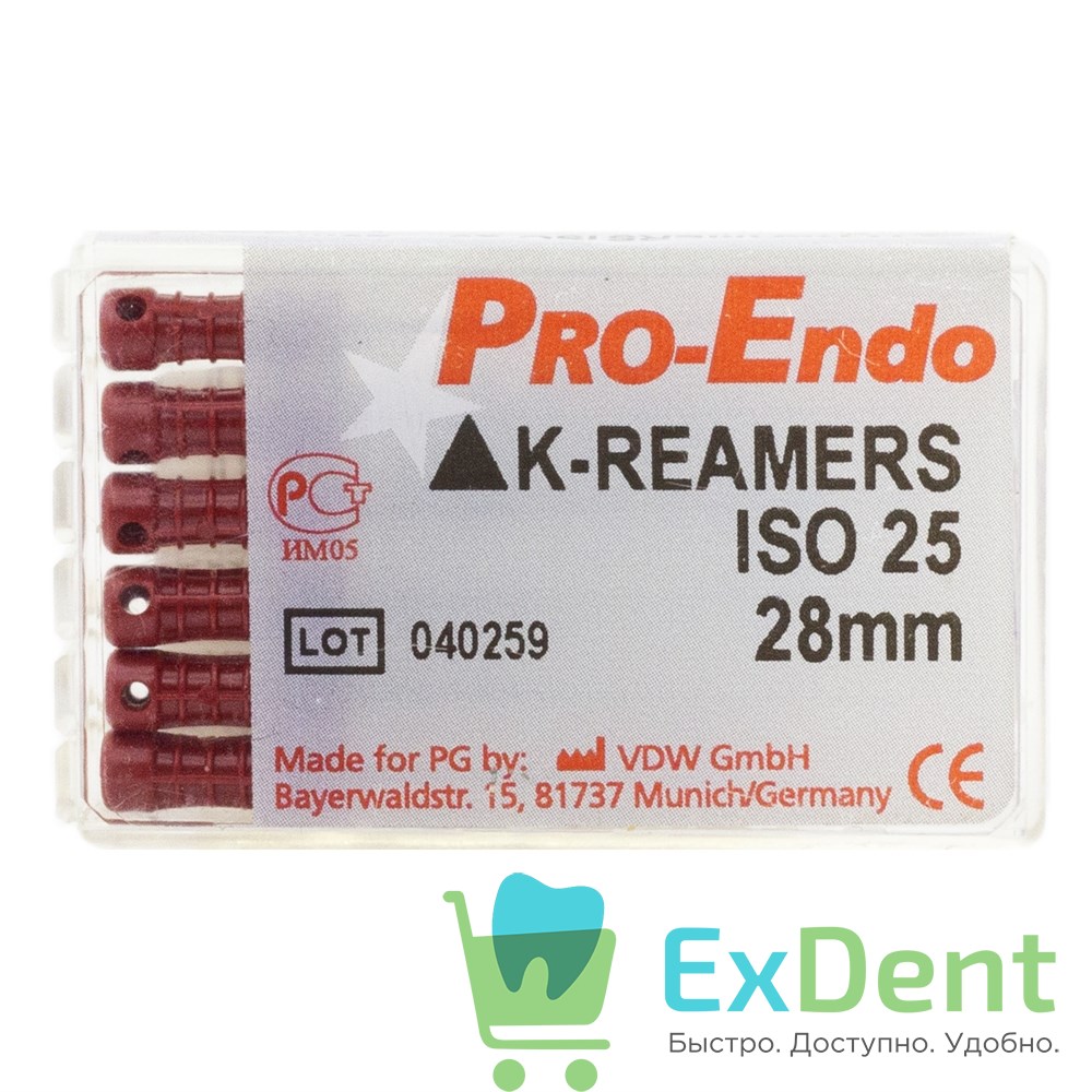 K-Reamers №25, 28 мм, Pro-Endo, для препарирования канала, нержавеющая сталь (6 шт)