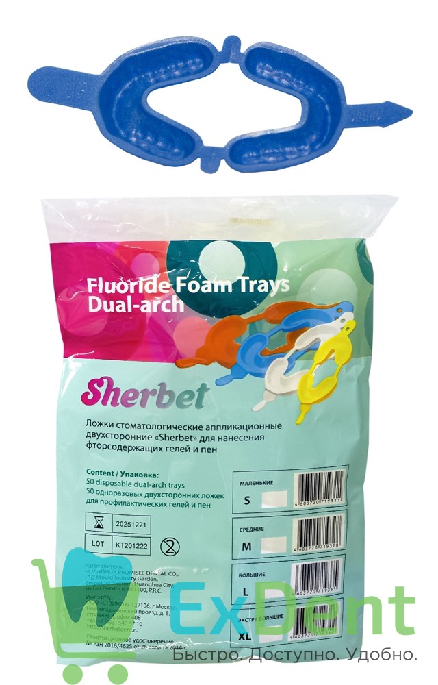 Двойные аппликационные капы Sherbet предназначены для аппликации реминерализирующих (фтор- и кальций-содержащих) гелей как в кресле стоматолога, так и в домашних условиях. Капа состоит из двух соединенных частей, для удобства проведения процедур одновременно верхней и нижней челюсти.