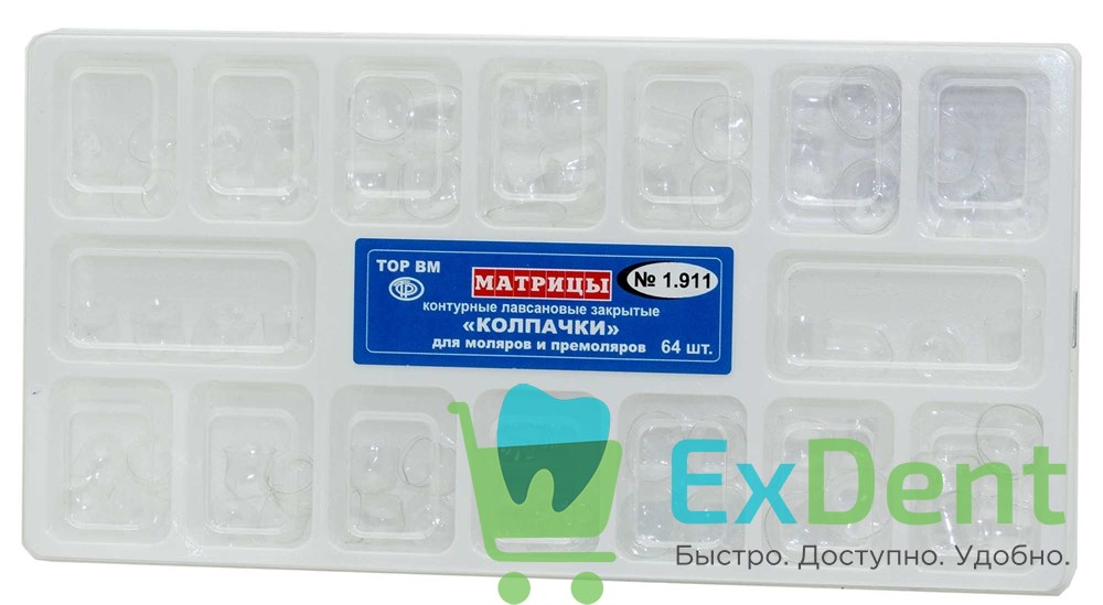 Купить Матрицы лавсановые контурные колпачки для моляров и премоляров (64 шт) произведенный компанией ТОР ВМ вы можете в ExDent.ru по цене 305руб.