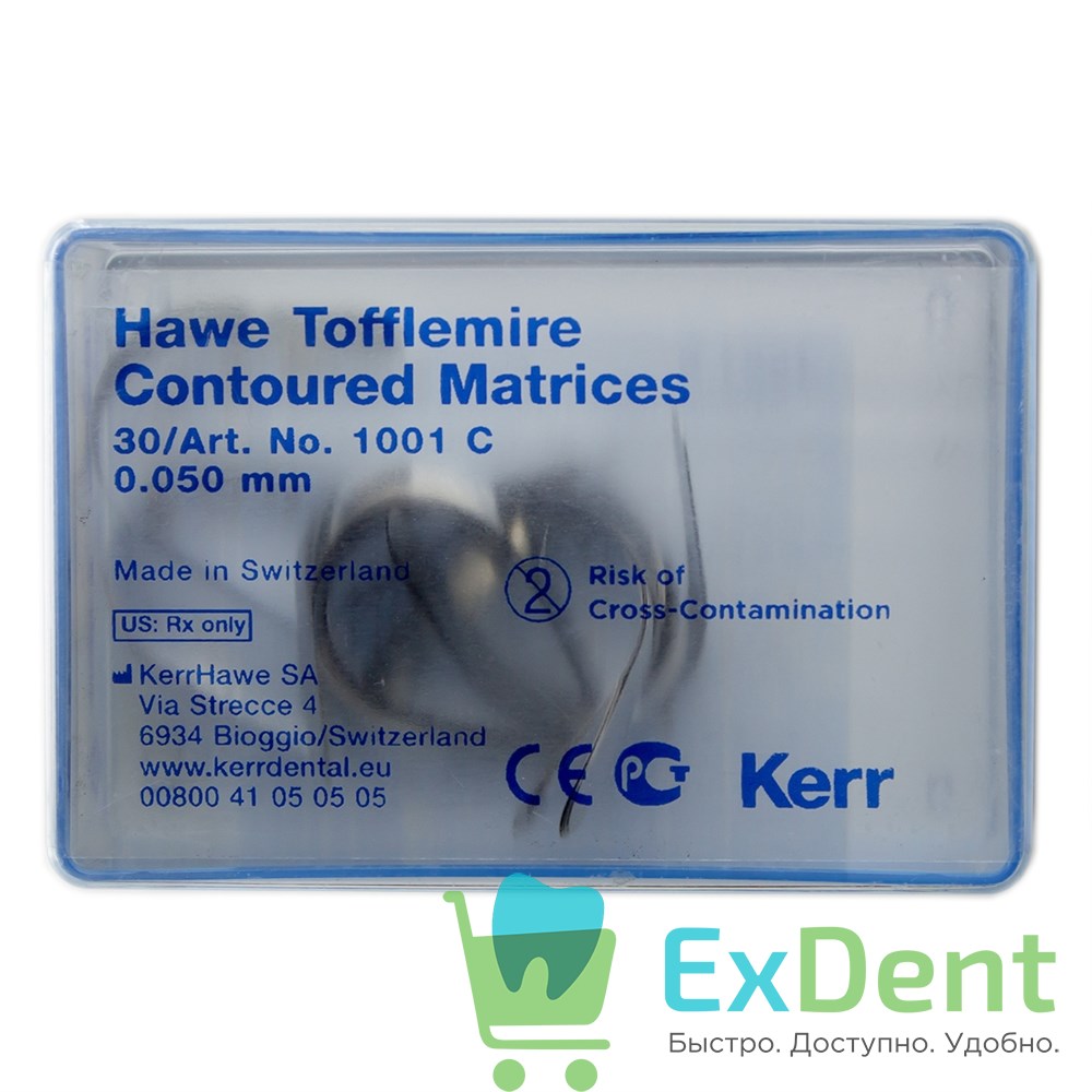 Купить Матрицы металлические контурные Tofflemire выпуклые, изогнутые по экватору (толщина 0.05 мм х 30 шт) произведенный компанией Kerr вы можете в ExDent.ru по цене 0руб.