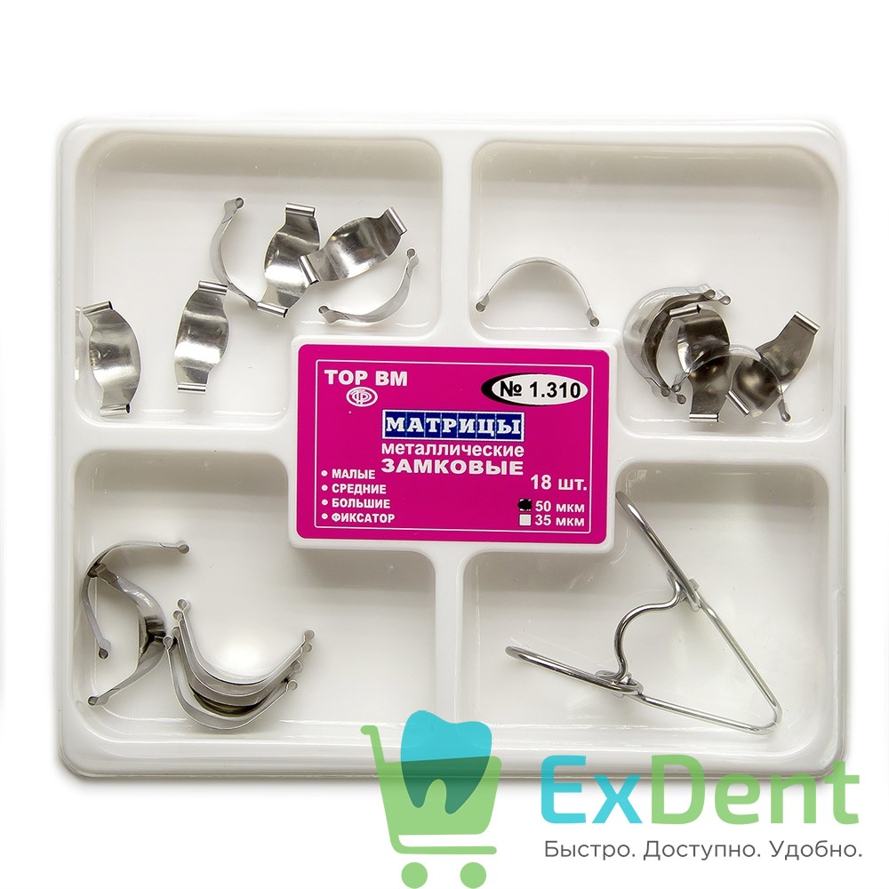 Купить Матрицы металлические контурные замковые, набор 3 вида + фиксатор (50 мкм х 18 шт) произведенный компанией ТОР ВМ вы можете в ExDent.ru по цене 740руб.