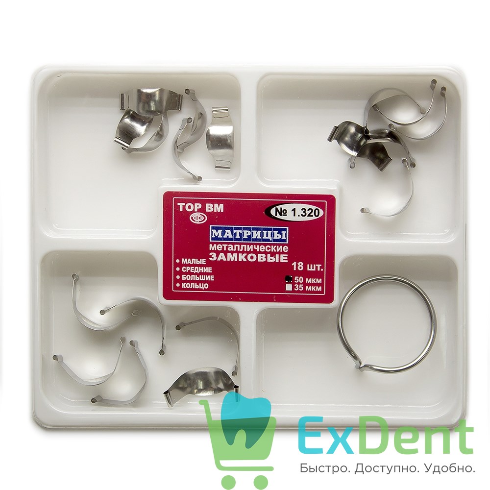 Купить Матрицы металлические контурные замковые, набор 3 вида + кольцо (50 мкм х 18 шт) произведенный компанией ТОР ВМ вы можете в ExDent.ru по цене 450руб.