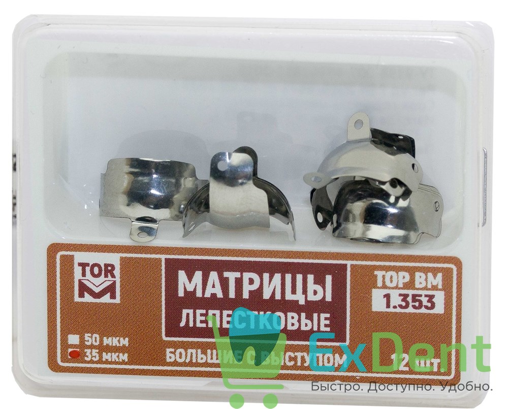 Купить Матрицы металлические лепестковые, большие с выступом 6,5мм (35 мкм х 12 шт) произведенный компанией ТОР ВМ вы можете в ExDent.ru по цене 300руб.