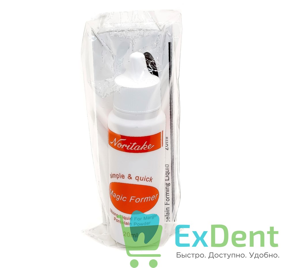 Жидкость для замешивания краевых фарфоров «Noritake Magic Former». Эту жидкость смешивают с краевым фарфором Noritake таким же образом, как обычную моделировочную жидкость. Готовый керамический край должен высохнуть и затвердеть. Приготовленная керамическая масса обладает хорошей адгезией к опаковому слою. При высыхании нанесенная масса полностью твердеет и приобретает начальную прочность, благодаря чему реставрация легко снимается со штампика без повреждения фарфорового края.