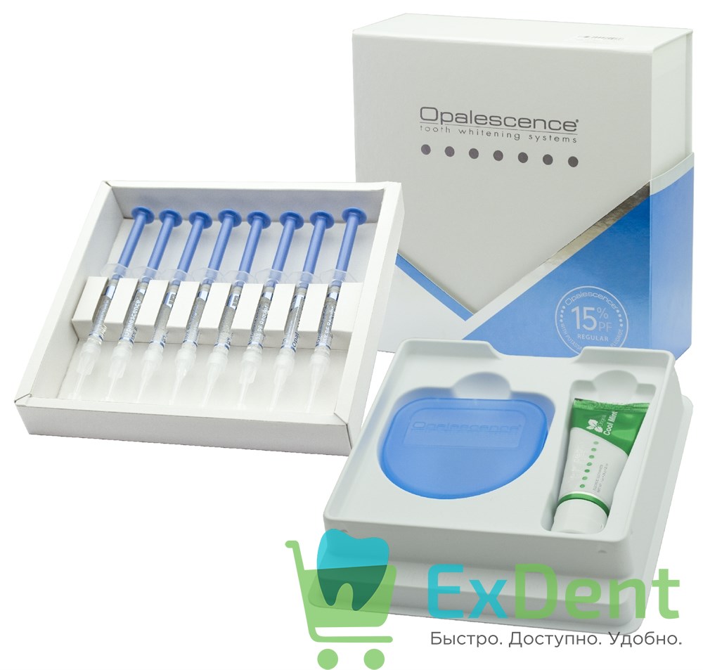 Opalescence 10%PF, 15%PF, 20%PF – отбеливающие гели на основе перекиси карбамида, содержащие нитрат калия и фторид натрия. Применяются в каппах. Наличие 20% воды в геле помогает предупредить обезвоживание и повторное потемнение зубов.