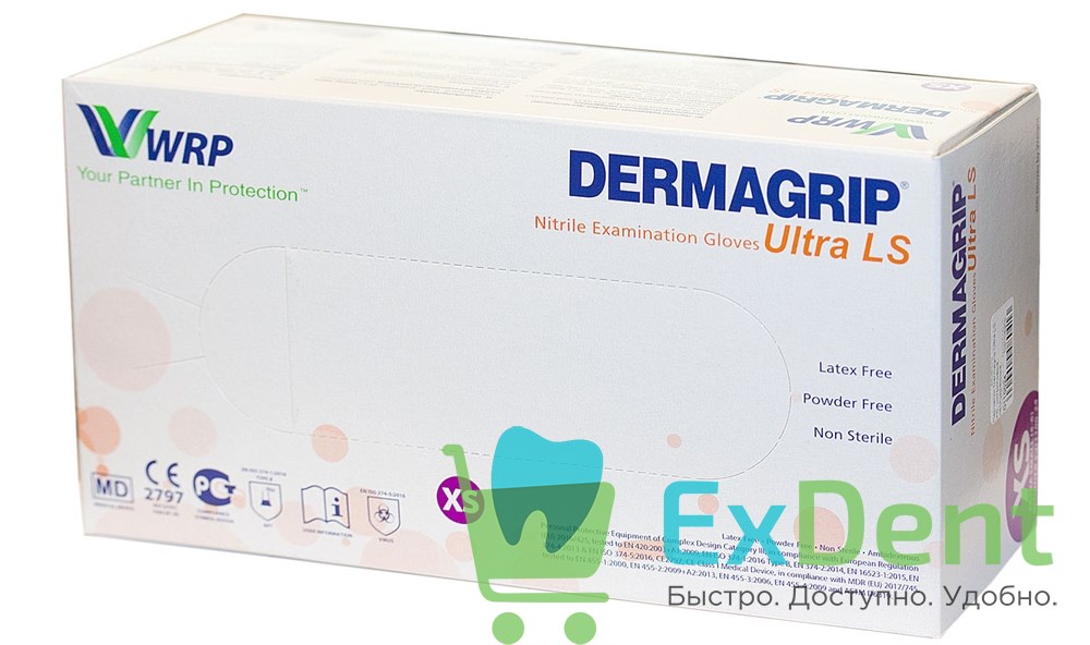 Медицинские перчатки Dermagrip Nitrile Ultra LS торговой марки WRP (Малайзия) - это нитриловые неопудренные нестерильные перчатки с текстурированной поверхностью пальцев. Не содержат протеины натурального латекса. Перчатки Дермагрип Ультра ЛС стойкие к антисептикам, гипоаллергенные, обеспечивают высокую тактильную чувствительность и отличную барьерную защиту от химикатов и различных жидкостей.