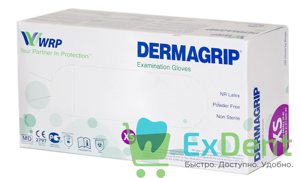 Купить Перчатки Dermagrip XS, латексные, неопудренные, нестерильные, смотровые (100 шт) произведенный компанией Dermagrip вы можете в ExDent.ru по цене 1 340руб.