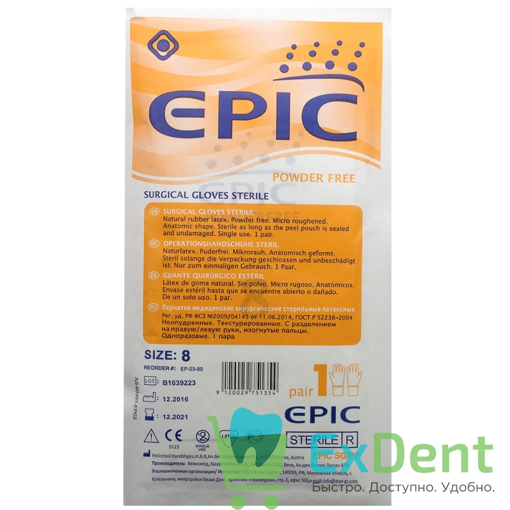 Купить Перчатки Epic (8 - M / L) - хирургические стерильные латексные неопудренные (1 пара) произведенный компанией вы можете в ExDent.ru по цене 0руб.