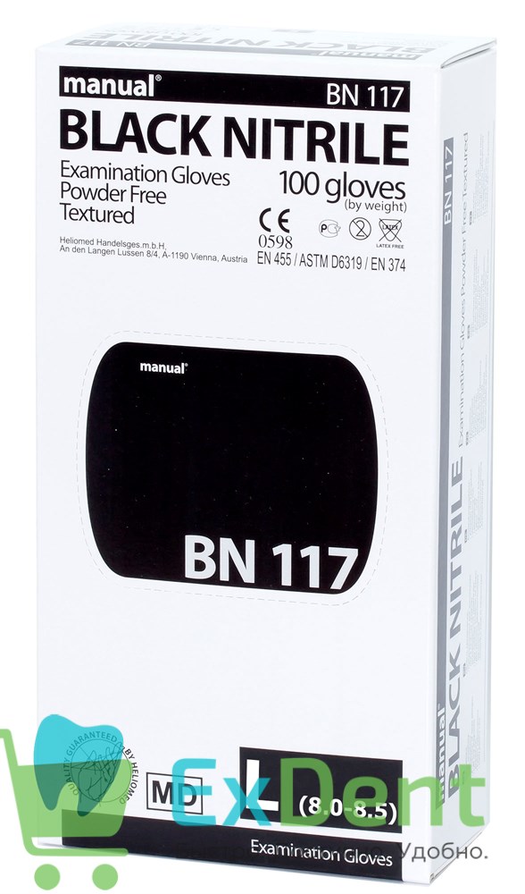 Купить Перчатки Manual L нитриловые черные, неопудренные, гипоаллергенные (100 шт) произведенный компанией Heliomed вы можете в ExDent.ru по цене 530руб.