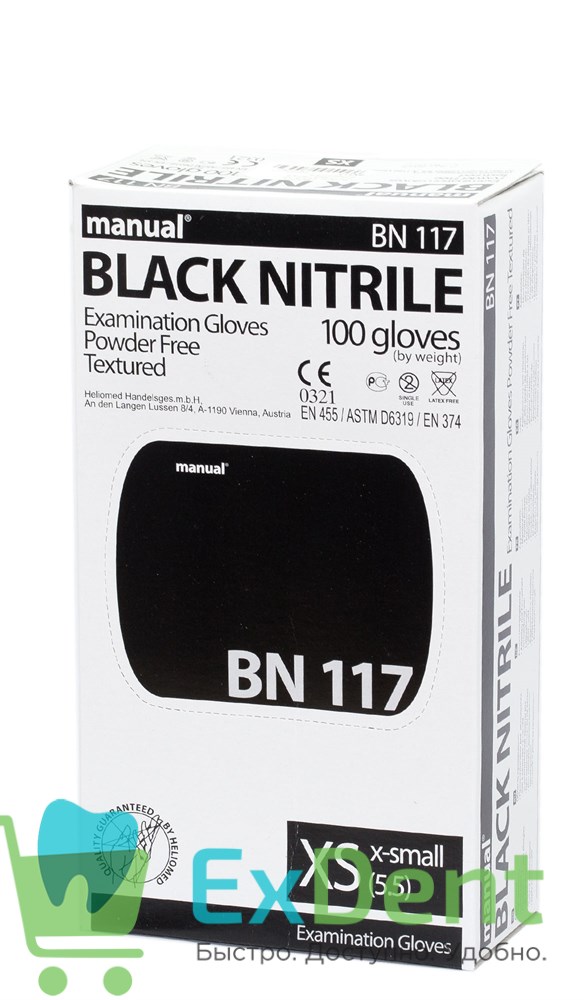 Купить Перчатки Manual XS нитриловые черные, неопудренные, гипоаллергенные (100 шт) произведенный компанией Heliomed вы можете в ExDent.ru по цене 530руб.