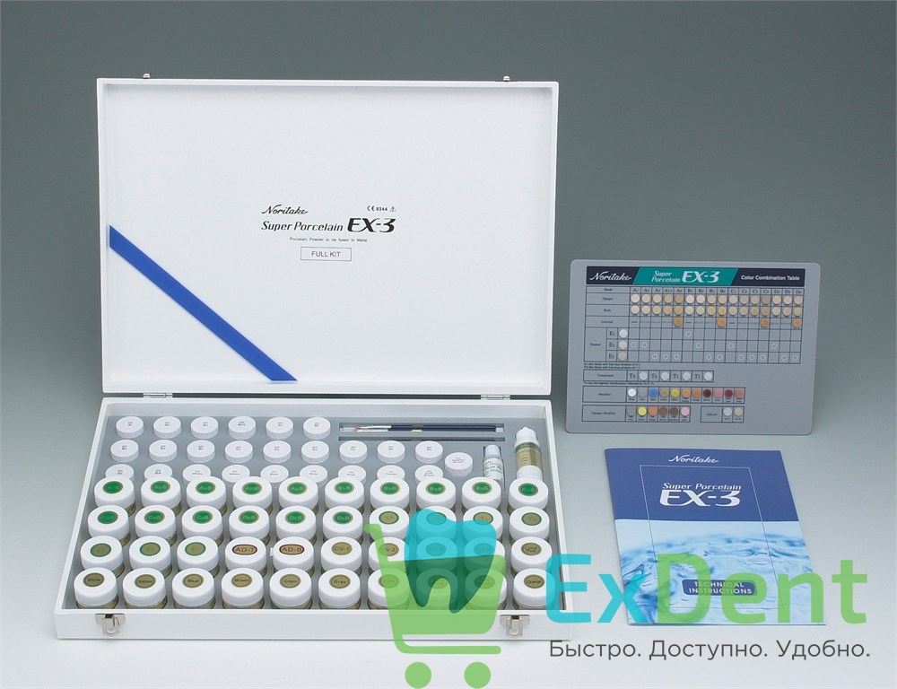 Профессиональный набор керамической массы "Super porcelain EX-3". Включает в себя все существующие оттенки дентинов и опаковых паст групп А, В, С и D, эмали, транспаренты и пришеечные массы для них, фарфоры для коррекции, модификаторы дентинового и опакового слоя, жидкости, кисточки и техническую расцветку.
