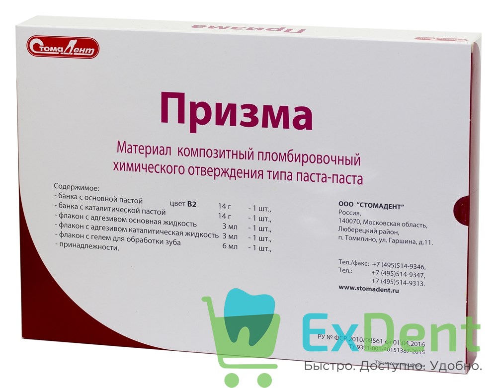 Призма композитный пломбировочный материал химического отверждения. Предназначен для восстановления полостей зубов I-V класса у взрослых и детей. Характеризуется высокой прочностью, и по этому показателю превосходит многие отечественные и импортные аналоги, не уступая им по другим физико-механическим характеристикам. Пломбы рентгеноконтрастны, цветостабильны, хорошо полируются, что обеспечивает косметический эффект реставрации.