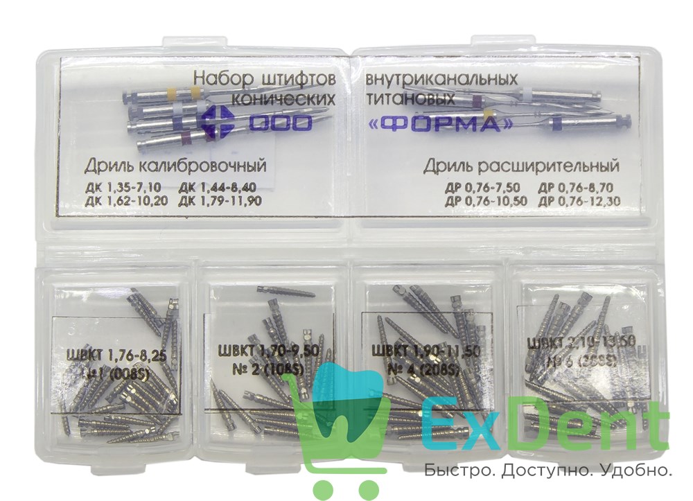 Купить Штифт титановый набор №1(80шт+8 дрилей) произведенный компанией ФОРМА вы можете в ExDent.ru по цене 0руб.