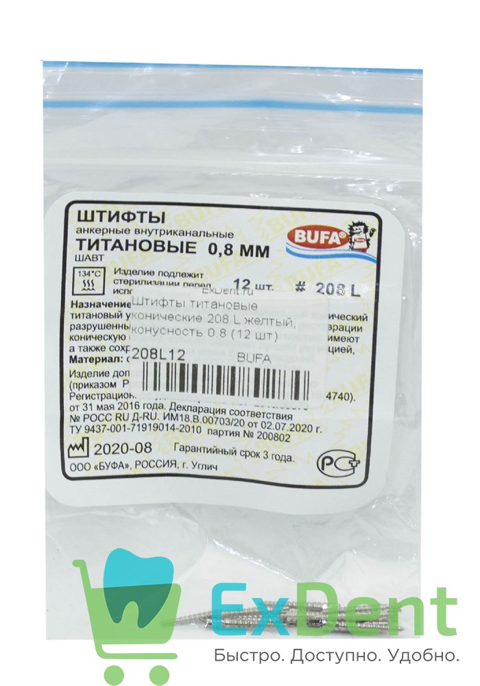 Купить Штифты титановые конические 208 L желтый, конусность 0.8 (12 шт) произведенный компанией BUFA вы можете в ExDent.ru по цене 250руб.
