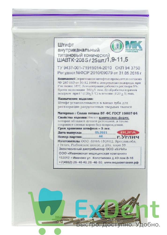 Титановые штифты выполнены из титанового сплава, обеспечивающего им исключительную прочность, легкость и полную биологическую совместимость с организмом человека. Этот материал по своим характеристикам прочнее стали, не подвержен коррозии даже в химически агрессивной среде полости рта, не образует опасных соединений, не вызывает аллергических реакций и обладает низкой теплоотдачей. Соответствие размеров и цветокодов маркировки торца привычным для врача стандартам создает дополнительное удобство при установке штифта.
