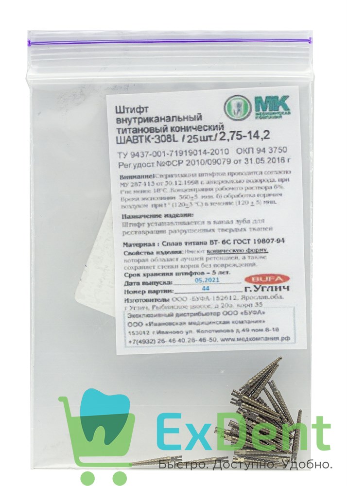 Титановые штифты выполнены из титанового сплава, обеспечивающего им исключительную прочность, легкость и полную биологическую совместимость с организмом человека. Этот материал по своим характеристикам прочнее стали, не подвержен коррозии даже в химически агрессивной среде полости рта, не образует опасных соединений, не вызывает аллергических реакций и обладает низкой теплоотдачей. Соответствие размеров и цветокодов маркировки торца привычным для врача стандартам создает дополнительное удобство при установке штифта.