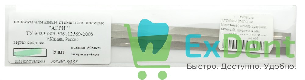 Купить Штрипсы (полоски алмазные) алмаз средний, зеленый, ширина 4 мм, основа 50 мкм АГРИ (5 шт) произведенный компанией АГРИ вы можете в ExDent.ru по цене 190руб.
