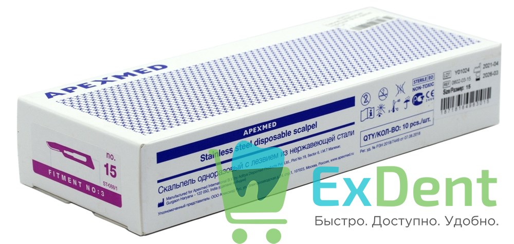 Купить Скальпель хирургический, стерильный, № 15, Apexmed (10 шт) произведенный компанией Apexmed вы можете в ExDent.ru по цене 540руб.