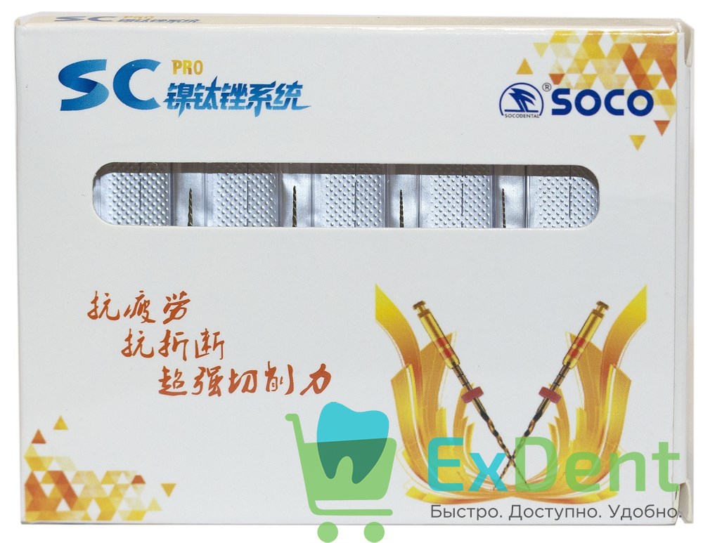 Машинные файлы с памятью формы из никель-титанового сплава для ротационного эндонаконечника Soco SC Pro - оригинальная разработка компании Soco. SC Pro так же, как и протейперы имеют режущую боковую грань, но в отличии от последних, за счёт феноменальной гибкости и отсутствия упругости точно идут по каналу, не выпрямляя его и сохраняя первоначальную форму. Отличаются возможностью запоминать форму, режущей боковой гранью и треугольным сечением. Как результат - безопасность в работе и полное сохранение анатомической формы канала. Модель SC Pro имеет специальное покрытие, дополнительно увеличивающее срок службы.